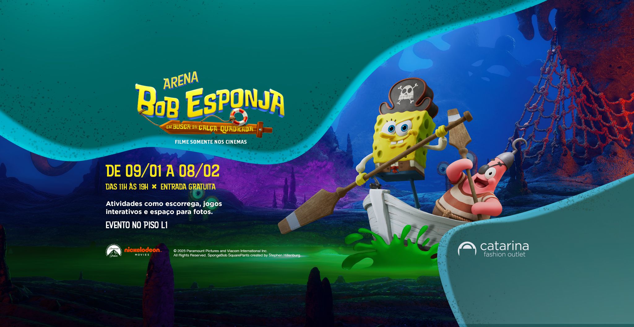 Nos dias 09, 10, 17 e 18 de janeiro, os personagens Bob Esponja e Patrick estarão com a gente em sessões de 30 minutos, das 12h às 18h.